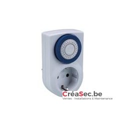 Branchement et débranchement à heures fixe d'appareils electriques. Programmation par quart d'heure, 96 programmes possible en 24 heures. Mise à la terre type français. Fontionnement sur 220-230v Puisance max 3500w 16A Dimensions en mm 120 x72 x 75. Poid 160 g